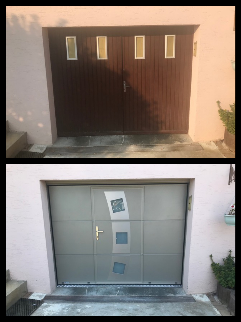 Le 24 Juil, 2018 Par admin90 Uncategorized 0 Commentaires Remplacement d’une porte de garage Installation d’une porte de garage sectionnelle avec portillon et hublot, coloris gris sablé